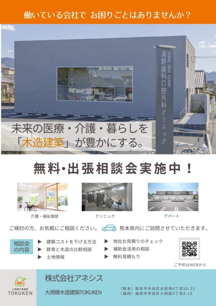 【2026年3月】木造建築×倉庫兼貸事務所 完成見学会 日程 2026年3月27日(金)・28日(土) 時間 ■午前10時~ ■午後2時~ 会場 熊本県熊本市西区松尾 定員になり次第、締め切らせていただきます。 ご予約後に、詳細のご案内をいたします。 【当日は無料特別相談会も実施】 詳細を見る イベント予約 【受付中】3月・4月出張相談会 日程 2026年3月2日~2026年4月30日の平日 時間 午前9時~午後5時 会場 貴社事務所にご訪問させていただきます。 熊本県全域にご訪問させていただきます。ご希望の日時をお問合せ内容にご記入ください。 詳細を見る イベント予約