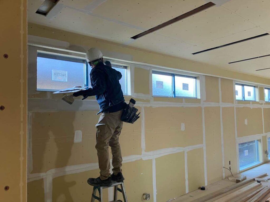 壁の下地を作り、断熱材を隙間なく敷き詰め、一枚一枚丁寧にボードを貼っていく。